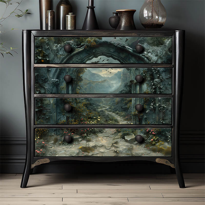 This captivating design features a grey gothic arch adorned with bats and framed by the iconic silhouette of Dracula’s castle. A meandering path beckons you into a mysterious landscape perfect for vampirecore crafting and macabre projects. Immerse yourself in the allure of vintage decoupage and gothic furniture upcycling with this hauntingly beautiful tissue paper. Let your imagination wander down the path of darkness and contact me for customization options to make this design uniquely yours.