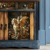 The design showcases an alicorn with a flowing mane and tail, large blue-tinted wings, and a woodland glade setting with subtle floral details. Perfect for creative decoupage, restoration, or upcycling projects, it evokes the elegance of old master paintings. Contact me for help with customization if needed.