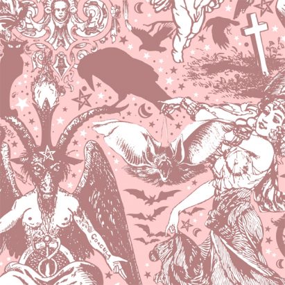 Witchy Pastel Goth Magical Mystical Scrapbook Pattern Leggings, featuring Baphomet, Cats, Ravens, Gypsy Girls, Bats and Spiders