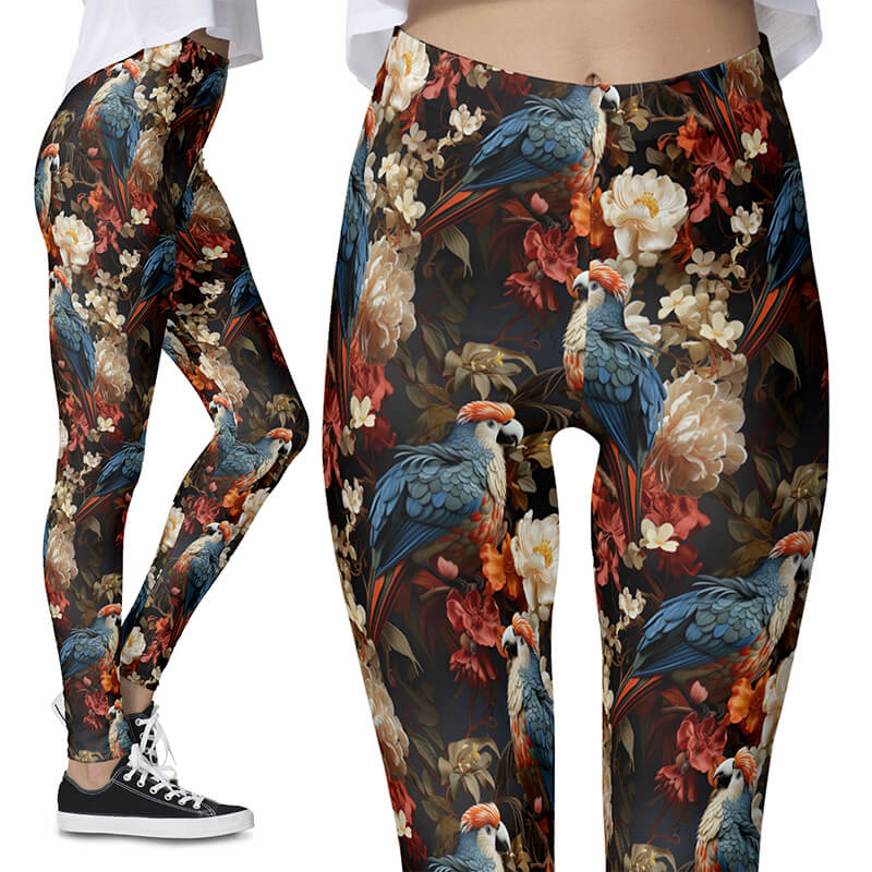 Ideal for fancy dress at a costume party or wear them just for fun. Ideal for the gym or everyday wear. Floral, jungle leggings, with birds of paradise. African parrots, jungle parrots, expedition leggings, vintage floral, Victorian, chintzy leggings. Brightly colored ornithologist leggings, bird spotters leggings.