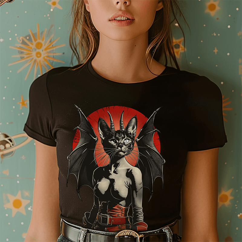 Featuring a unique design of a cat with a sexy female human body in a tight red latex space suit, this t-shirt is perfect for fans of 1960s-70s style outer space and sci-fi films. Ideal for those who love vintage sci-fi fashion, this shirt will make a standout addition to your wardrobe. Contact me for help with customization if needed.