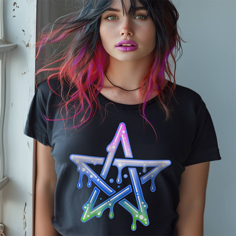 The retro design features a dripping shiny pentagram in Pastel Goth hues, a nod to 1980s electronica and EDM music. Perfect for cybergoth raves, this gothic tee comes in Pink, Blue, and Green on a black canvas. Express your love for all things gothic and cyber goth with a subtle yet eye-catching edge.