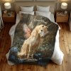 This fleece blanket features a classical white unicorn with vibrant orange butterfly wings in a renaissance-inspired woodland scene.