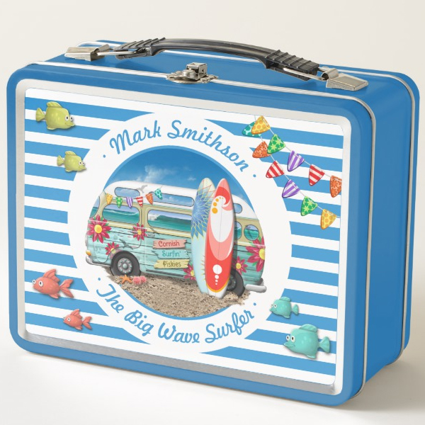 A ‘Cornish Surfin’ Piskies’ camper van adorns this lunch box with fish friends and bunting. Ideal child’s gift, or for anyone who absolutely loves surfing and holidays on the beach. Perfect for taking to the beach when on a summer holiday, or for just as a family keepsake box for photos and memories of Summers long past. The camper van has “Cornish Surfin’ Piskies” on the side, because in Cornwall Pixies are called Piskies!